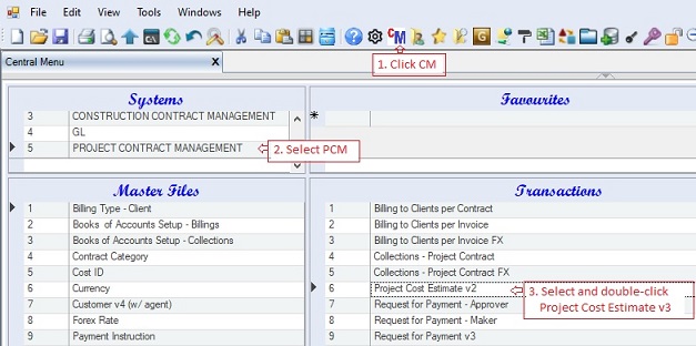 3. Double-click Transactions -> Project Estimate v3. You will be redirected to Project Estimate tab window.