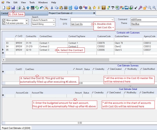 5. Double-click DTS -> Get Cost IDs. This will retrieve all the Cost IDs for the data grid Cost Estimate Summary. Also all the accounts in the chart of accounts where the Cost IDs are linked will be retrieved for the data grid Cost Estimate Detail.