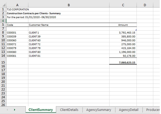1. Client Summary = contains the summary of total contracts per client on a given period.