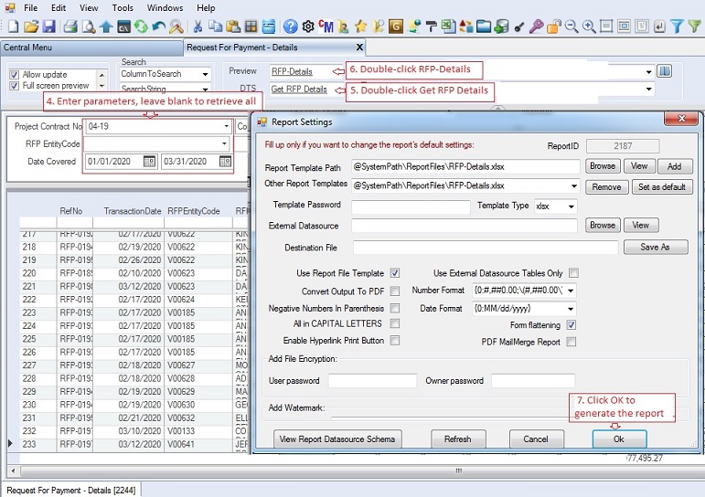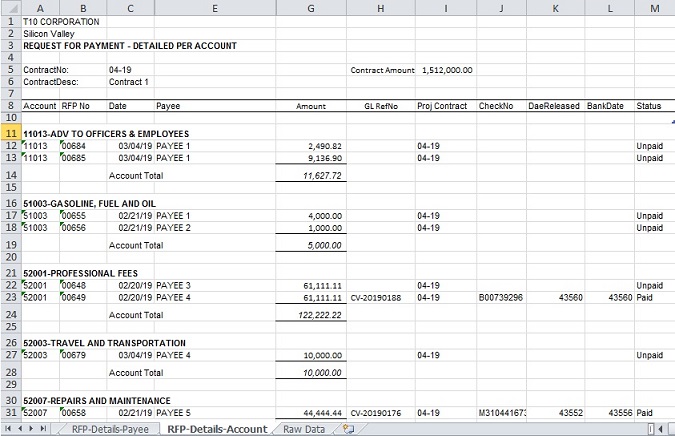 This report shows the summary and detaialed status of each RFP. It can be used to monitor the cost of each contract. It contains the following sheets: