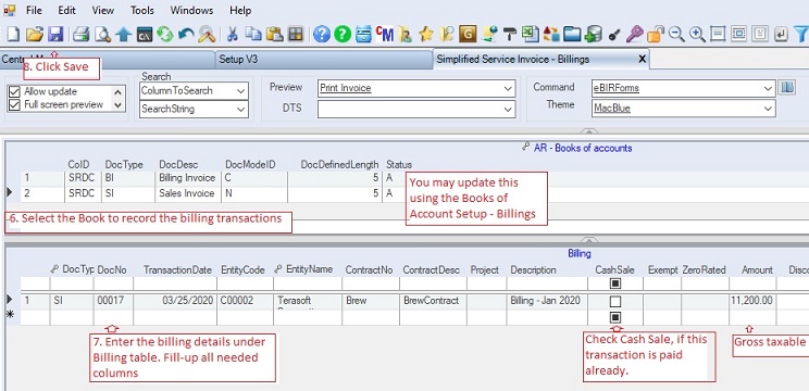6.Select the book to where the billing will be recorded.. Data on this grid are taken from the master file: Books Of Accounts Setup - Billing.